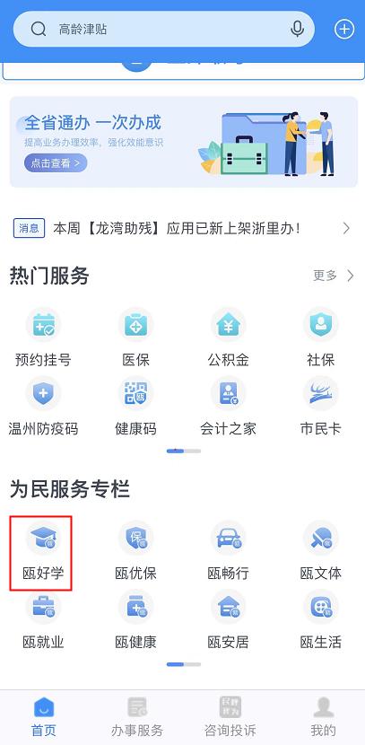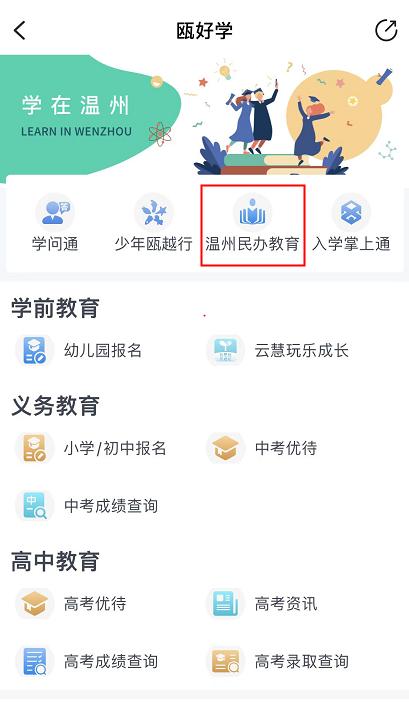 第二步:在搜索框输入“温州民办教育”或选择主页“瓯好学”栏目进入选择顶端“温州民办教育”。