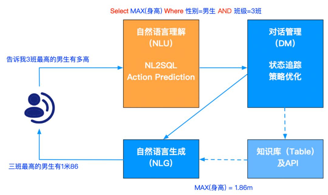 如果进一步考虑到多轮的情况,用户可能会接着上文问:“那最矮的呢?”,这个时候就需要利用上下文进行对话管理。除此之外,表格中的内容一般比较简练,经常是以实体词的方法呈现,比如身高值可能就是 “186”,如果只把这个数字返回给用户,可读性非常不友好。优雅的方式是结合上下文回复 “三班最高的男生有 1 米 86”,这就需要一个忠实且流畅的自然语言生成能力。