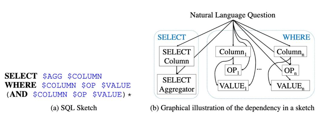 一个直接的想法是将自然语言到 SQL 的转换过程看做序列到序列生成问题,但在领域初期,受限于无法保证序列生成的结果准确性,表现一直不佳。而相比直接利用 Seq2Seq 建模,后续大部分的工作将 SQL 的生成过程转换为等价的分类问题 (Seq2Set) [3]。如下图 4 所示,通过将 SQL 拆解为不同的子模块,比如 SELECT、WHERE 等,然后利用多任务的方式进行子模块的预测,最后进行 SQL 的组合。这样不仅可以保证 SQL 语法正确,速度上也有明显优势。