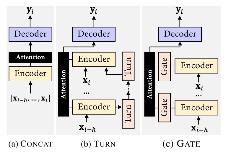 图 8:多轮建模中的直接拼接、turn attention 和 gate attention 示例 [11]