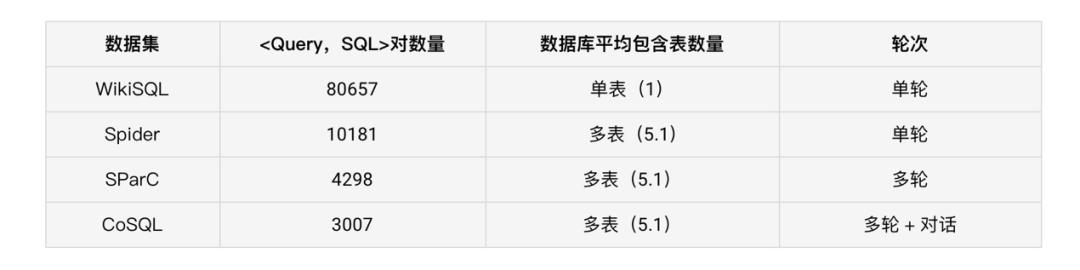 近些年来,TableQA 任务得到了学术界及工业届的共同关注,并取得了飞速的发展。而 Text-to-SQL 作为 TableQA 的核心技术 ,学术界推出了包括单表单轮 WikiSQL[2]、多表单轮 Spider[13]、多表多轮 SparC[14]、对话式 CoSQL[15] 等四个权威的国际公开数据集及榜单。根据每个数据库包含的表数量,可以分为单表和多表 (WikiSQL, Spider)问题,其中多表要求 SQL 有表格选择(join)的能力,生成的 SQL 较为复杂;根据问句的交互轮次,可以分为单轮和多轮 (SParC),多轮问题涉及到多轮理解,对模型的指代消歧及上下文建模能力提出了要求。进一步的,Text-to-SQL 可以融入到对话系统 (CoSQL),对理解、策略和生成能力提出了更高的要求,进一步提升任务的难度。