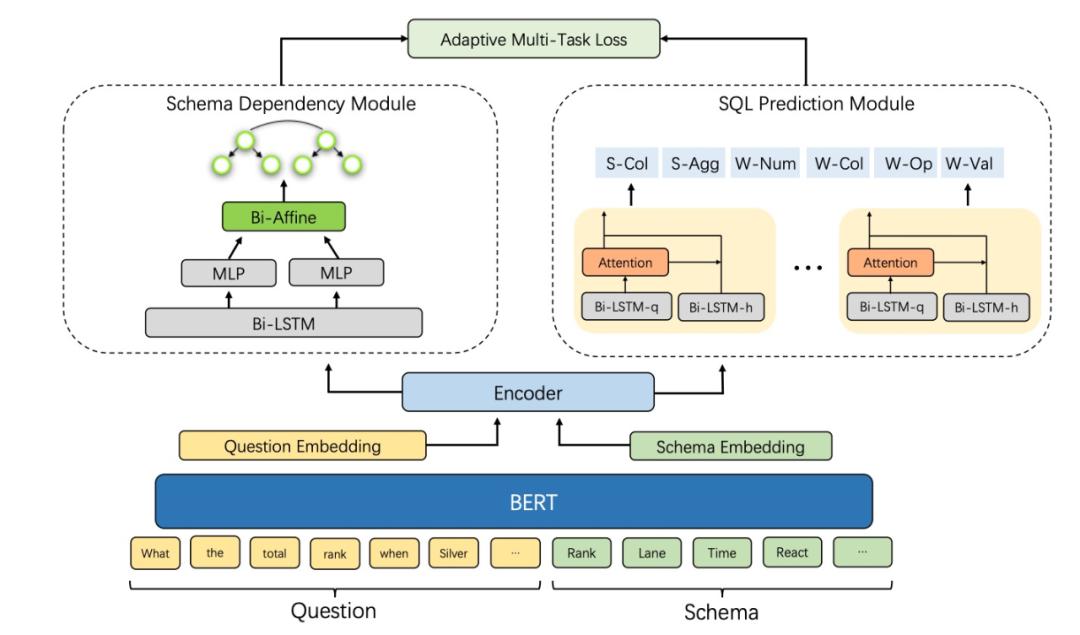 基于这种建模方式,达摩院提出一种新的解析模型 SDSQL。如下图 11 所示,将自然语言问题与 Schema 作为输入,然后利用多任务的方式优化模型:一个任务是利用双仿射的网络结构来预测解析好的 Schema Dependency,强化模型的模式链接能力;另一个任务是通过分类的方式来预测 SQL 中的每一个组件,从而完成 SQL 的预测。