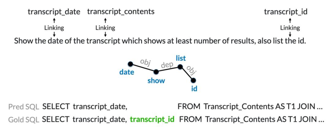 如下图 14 所示,在模式连接正确的情况下,仍然无法预测到正确的 SQL。在这个例子中,因为按照词粒度的距离 id 和 date 的距离很远,导致在 SELECT 部分丢失了 transcript_id 这一列。