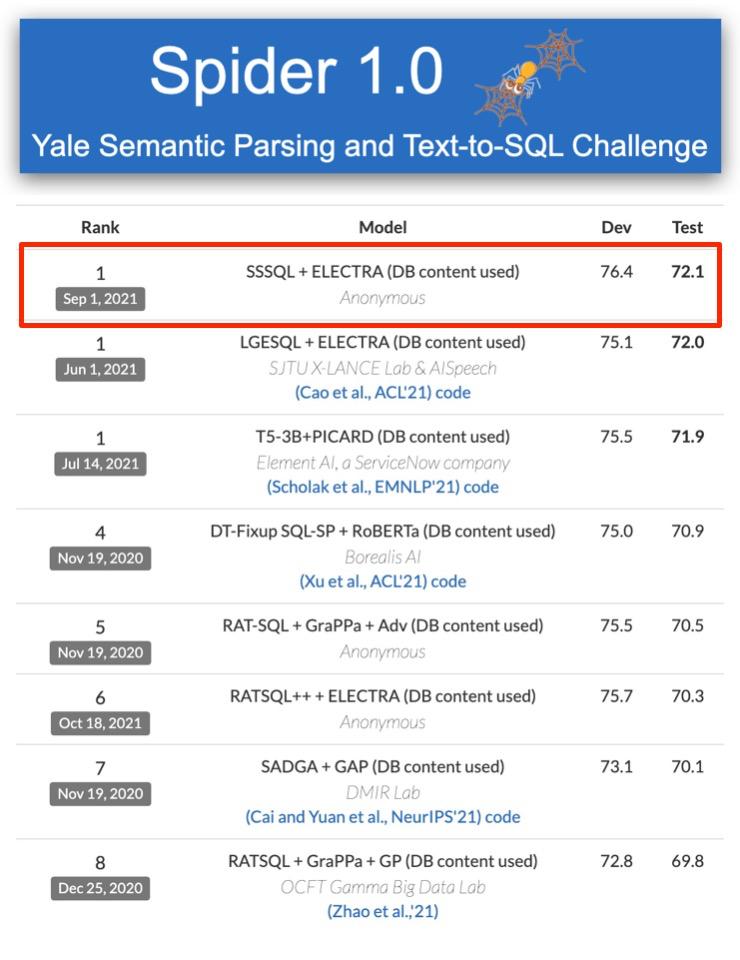 就效果而言,2021 年 9 月, SSSQL 在 Spider 上取得了 SOTA 的成绩: