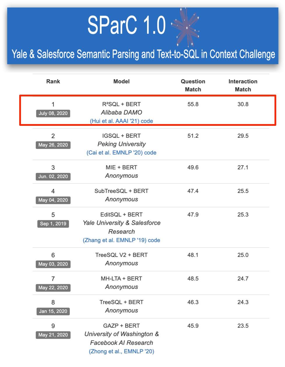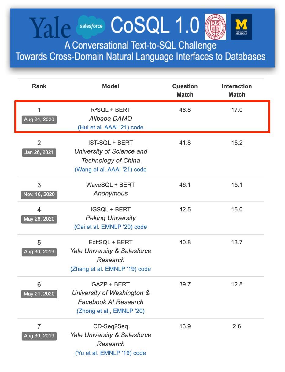 R⊃2;SQL[17] 模型的内容详见下一部分。2020 年 7 月,R⊃2;SQL 模型在 SParC 榜单取得第一。