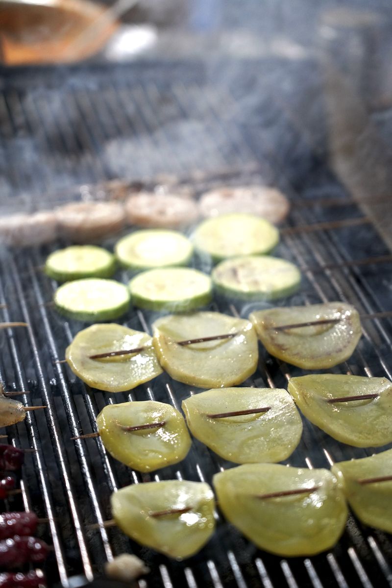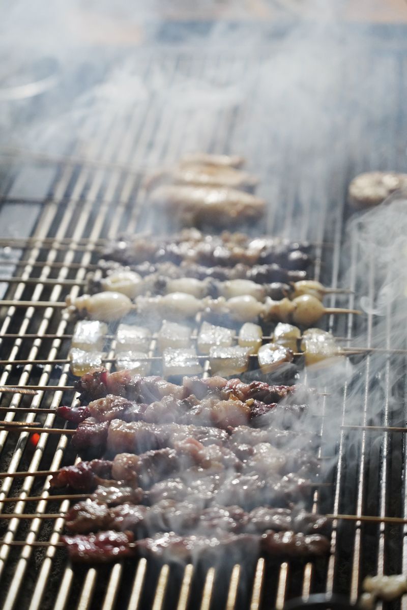 烤肉在烧烤架上滋滋发出声响,一滴热油顺着饱满的肉的纹路慢慢滑下,烟火缭绕,令人心醉。猪皮微黄、蜷缩的一刻,火候正足,油花滋滋冒出来,刹那间香气扑鼻。细细地嗅,慢慢地闻,馋虫迅速被勾起。将烤好的肉裹上蘸水,往嘴里一送,满口火热沸腾,幸福感满满,肉经炭火洗练,香气四溢,混合着蘸水的麻辣,与肉的嫩滑,焦酥,鲜咸在口中交织在一起。
