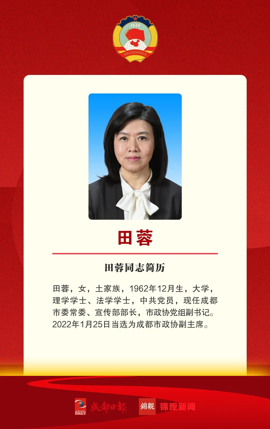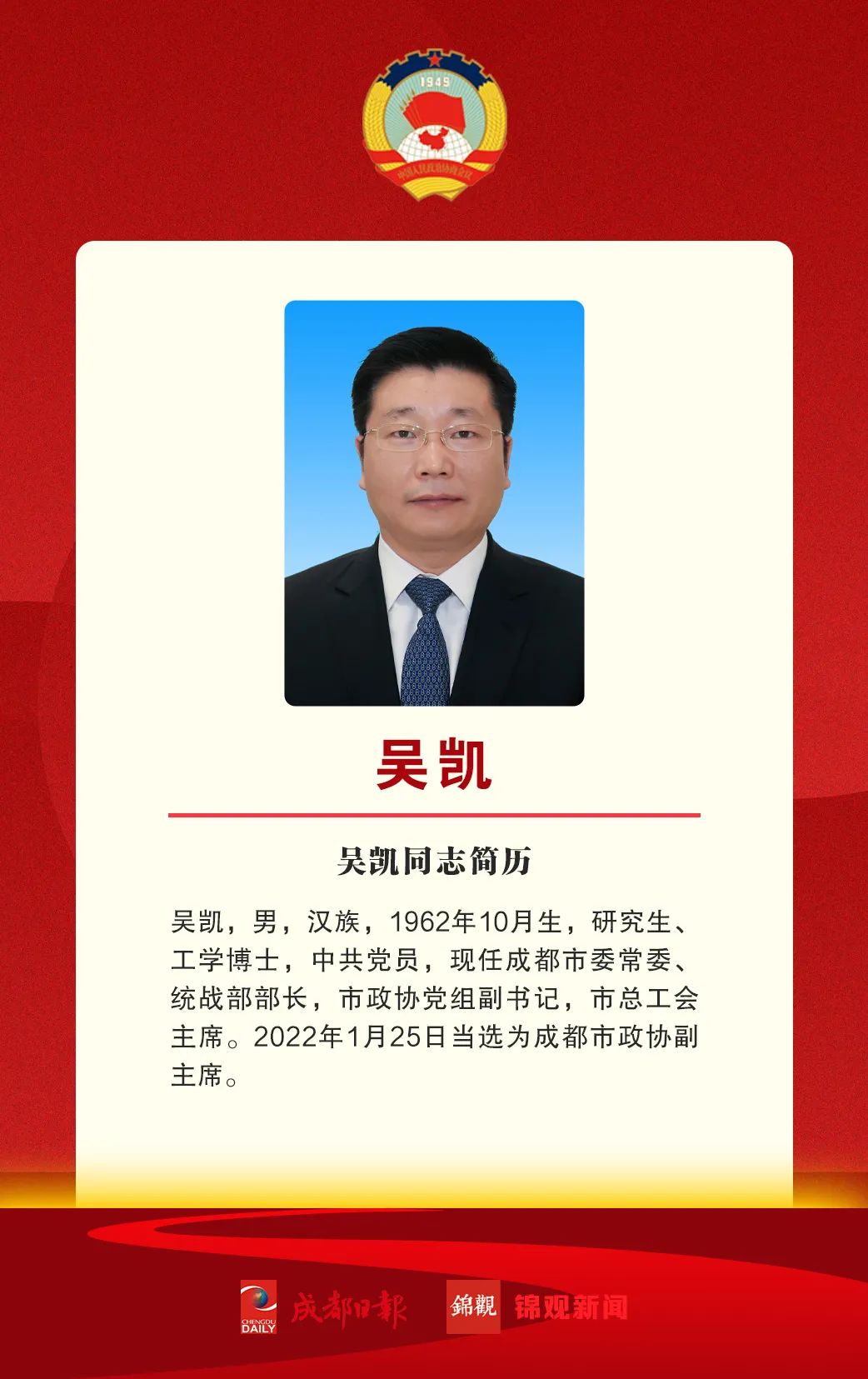 在1月25日政协第十五届成都市委员会第五次会议上,吴凯、田蓉当选为政协第十五届成都市委员会副主席,杨东升当选为政协第十五届成都市委员会秘书长。