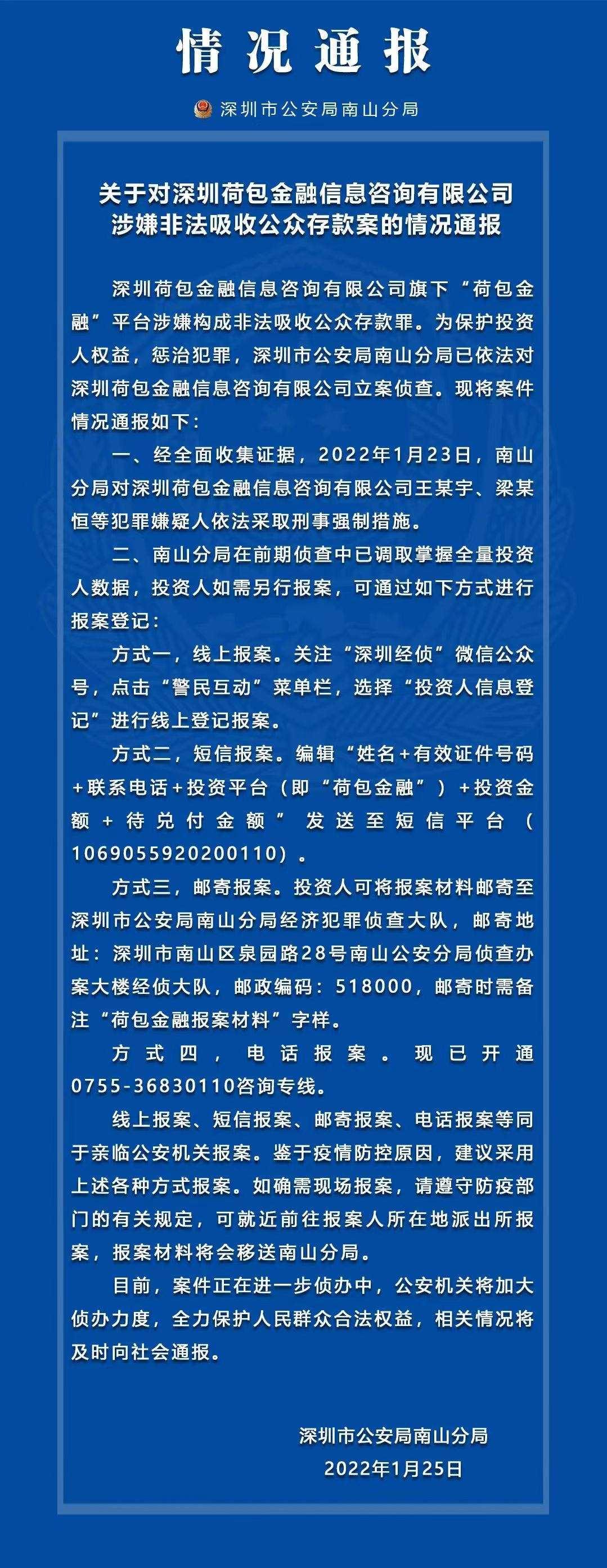 警方通报信息显示,深圳荷包金融信息咨询有限公司旗下“荷包金融”平台涉嫌构成非法吸收公众存款罪。为保护投资人权益,惩治犯罪,深圳市公安局南山分局已依法对深圳荷包金融信息咨询有限公司立案侦查。现将案件情况通报如下: