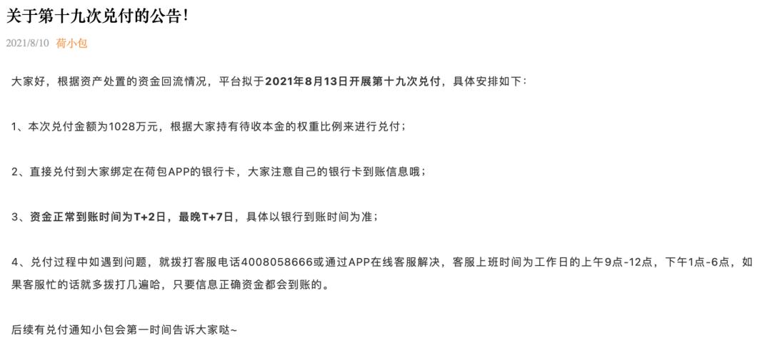 截至目前,荷包公司自宣布清退至今总共发布过19次《兑付公告》,最近一次为2021年8月份10日,距今已近5个月的时间。