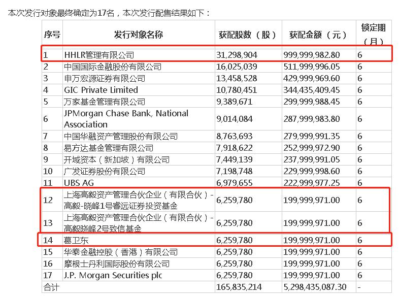 公告显示,不少知名机构获配股份,高瓴旗下的HHLR管理有限公司获配约10亿元,高毅邓晓峰合计获配近4亿元,中国国际金融股份有限公司、易方达基金分别获配5.12亿元和2.53亿元。此外,葛卫东在本次定增中也获配近2亿元。