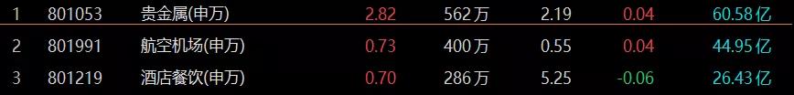 从盘面上看,仅贵金属、机场、酒店餐饮三个板块上涨,其余板块全部下跌。