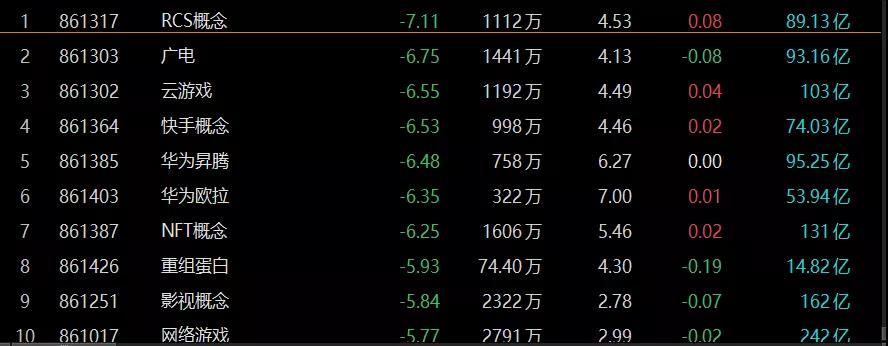 概念板块上,RCS概念、广电、云游戏、华为昇腾、华为欧拉、NFT概念等板块跌幅居前。