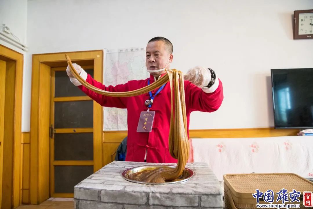 图为王立斌制作糖瓜粘。中国雄安官网牛思佳 摄雄安新区级非物质文化遗产传承人王立斌多年跟随母亲刻苦学习家传制糖技艺,深入挖掘糖瓜粘产品的设计、技艺精髓,2019年入选雄安新区级第一批非物质文化遗产传承人。