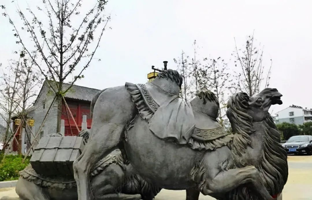 今人重建的铜驼暮雨从曹魏宫殿的南门出发,就是曹魏各级大小官吏的官署,其中太尉府的门口摆着巨大的铜驼,所以这条路也被称为铜驼街,《晋书·索靖传》记载:“靖有先识远量,知天下将乱,指洛阳宫前铜驼,叹曰:'会见汝在荆棘中耳!'”