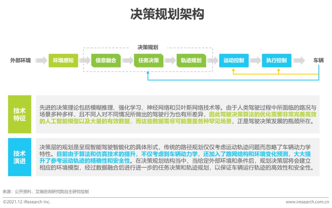 决策规划:通过环境感知的结果进行数据融合,结合高精地图数据确定合适的工作模型,决定相应的轨迹规划方案,以达到替代人类作出驾驶决策的目的,将智能汽车以拟人化的方式融入整个交通流当中,解决“我去哪”的核心问题。