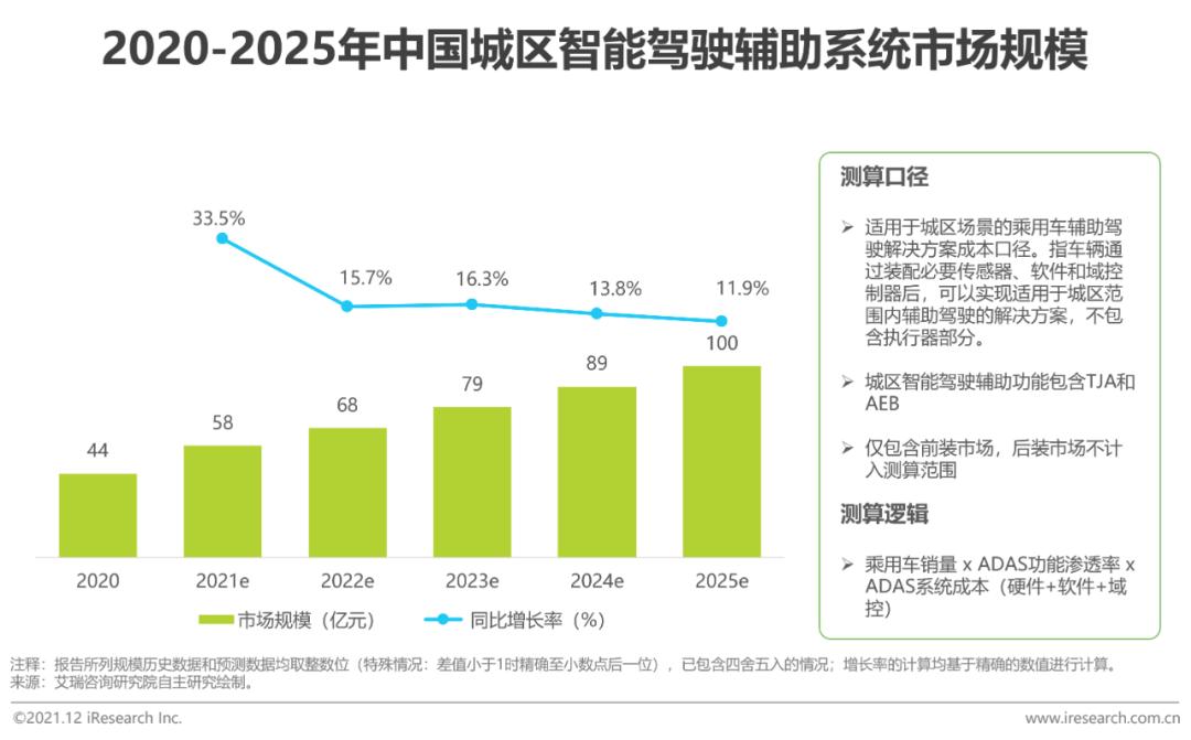 随着车企对车辆辅助驾驶功能的推广,汽车电子化、自动化水平的不断提高,ADAS功能渗透率不断上升。同时,在城区范围的TJA和AEB功能可解决驾驶员在交通拥堵下的痛点,提升驾车时的安全性。由于城区场景的复杂度较高和目前的法规、技术和落地性等问题,专门为城区场景开发的ADAS功能较少,预计相关法规出台后L2及L3级别适用于城区场景下的功能将不断丰富,装车量逐渐增多。在目前的法规状况下,艾瑞测算,2021年城区智能驾驶辅助系统市场规模约为58亿元,增长率达33.5%。