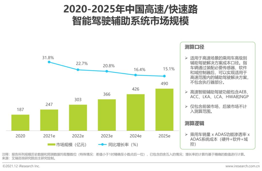 高速场景的半封闭性和较低的路况复杂性使得驾驶员更加愿意使用辅助驾驶功能,消费者接受度较强,实用性较高,其装车量有望不断提升。艾瑞测算,2021年高速智能驾驶辅助系统规模约为247亿元,增速达31.8%;随着装车量的不断提升,在2025年市场规模有望达到490亿元。