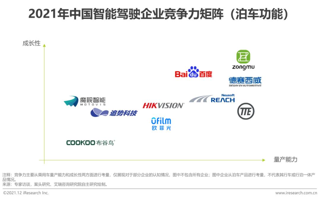 国际主流供应商更为关注前向Driving ADAS功能,同时新产品研发较为谨慎,需要较长的研发周期,因此国内供应商和主机厂在泊车领域存在更多机遇,在高阶智能泊车AVP功能上尤为明显。纵目科技、百度和德赛西威等处于行业领先地位,其拥有较为丰富的量产经验,产品稳定性和可靠性,拥有软硬一体化能力,已获得多家主机厂量产定点并有搭载其智能泊车系统的乘用车批量上市。其他玩家同样拥有核心能力,但相对缺乏乘用车量产经验,进入市场较晚。由于整体智能驾驶汽车市场上行,泊车功能渗透率不断升高,整体行业仍有较大的发展空间。
