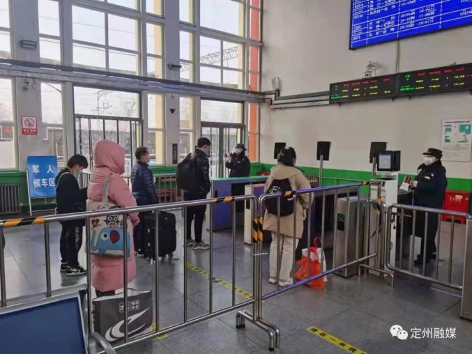 春运期间,定州站增开售票窗口,增设自动取票机,增加引导员,适时调整售票窗口布局。客流高峰期,人工售票窗口全部开启,适时延长售票时间,取票高峰期,在售票厅广场增加人工应急换票口,提高换票速度,减少旅客购票排队等候时间,并根据客流变化,增开进站通道,便捷旅客快速进站候车。同时,定州站组织全站休班干部职工成立志愿服务队,在售票厅、候车厅、站台等区域值守,为孕妇、残障等特殊旅客提供协助购票、快速进站、便捷出站等一条龙爱心服务,方便广大旅客出行。