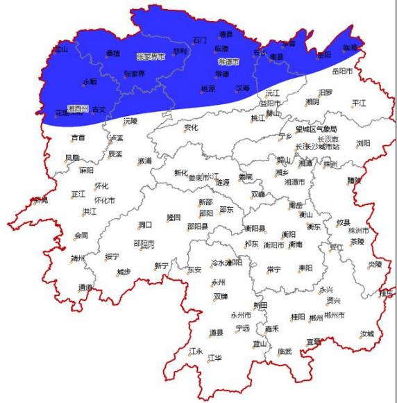 湖南省气象台今天16时发布暴雪蓝色预警:预计27日20时至28日20时,岳阳北部、常德、张家界、益阳北部、湘西州北部将出现≥7.5毫米的降雪,且岳阳北部、常德、张家界、益阳北部、湘西州北部将出现≥5厘米的积雪,请注意防范。