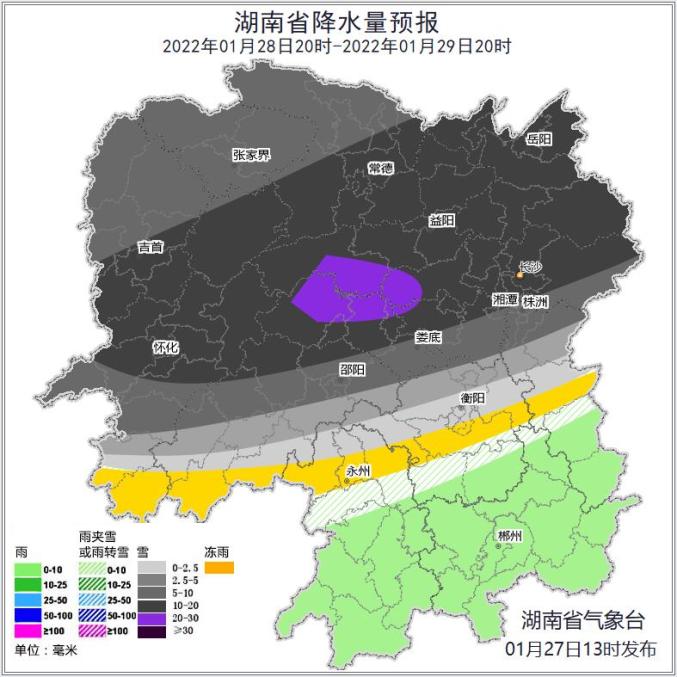 据湖南省气象台预计,1月27日晚起至29日白天,湖南将经历大范围雨雪天气,这次过程有几个点非常值得关注:影响范围广、降水持续久、强雨雪和冻雨都有。28日至29日白天为降雪最强时段,湘中及以北有暴雪到大暴雪。29日晚至30日,省内自北向南天气短暂转好,大部分地区以多云天气为主,30日湘中及以北、31日湘东地区早晨有雾。