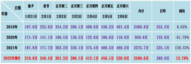 基于湖南省高速公路综合管理平台大数据分析,预计2022年春节期间全省高速公路出入口通行车辆总数为2,589.6万辆,同比增长约13.79%,占春运总流量的23.1%。日均流量369.9万辆,是平日的1.8倍。峰值日出现在正月初六(2月6日),峰值日流量为520.8万辆,是平日的2.6倍。