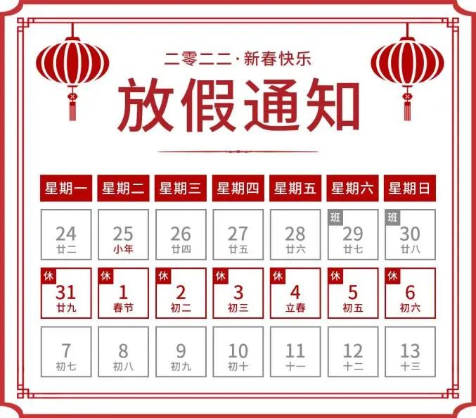 2022年的春节放假时间为1月31日至2月6日,共7天。今年春节期间7座以下小客车高速公路免费通行,免费时间为1月31日0时至2月6日24时。