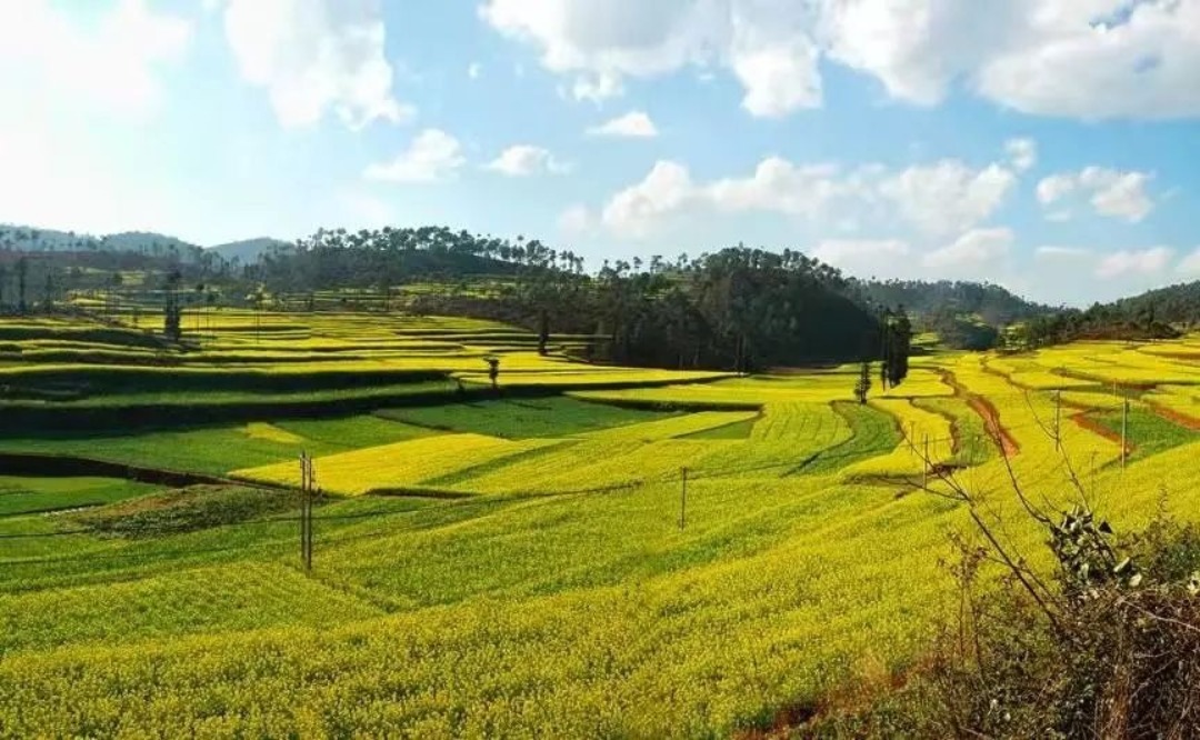 一朵朵、一簇簇、一丘丘、一片片的油菜花,从山头铺到箐底,从地角开到沟边,遍地金黄的油菜花与蓝天白云相互呼应,美不胜收。