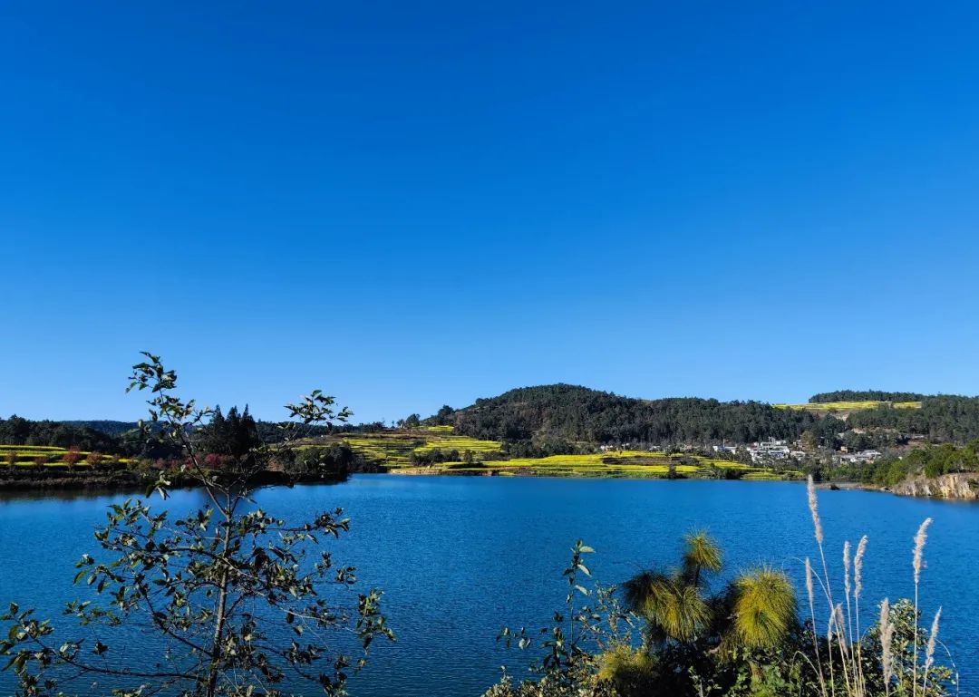 大西村大西水库旁的油菜花也是一绝,一潭碧水满目苍翠,青山与油菜花相依,加上湛蓝的天空,构成了一幅美丽的油画。