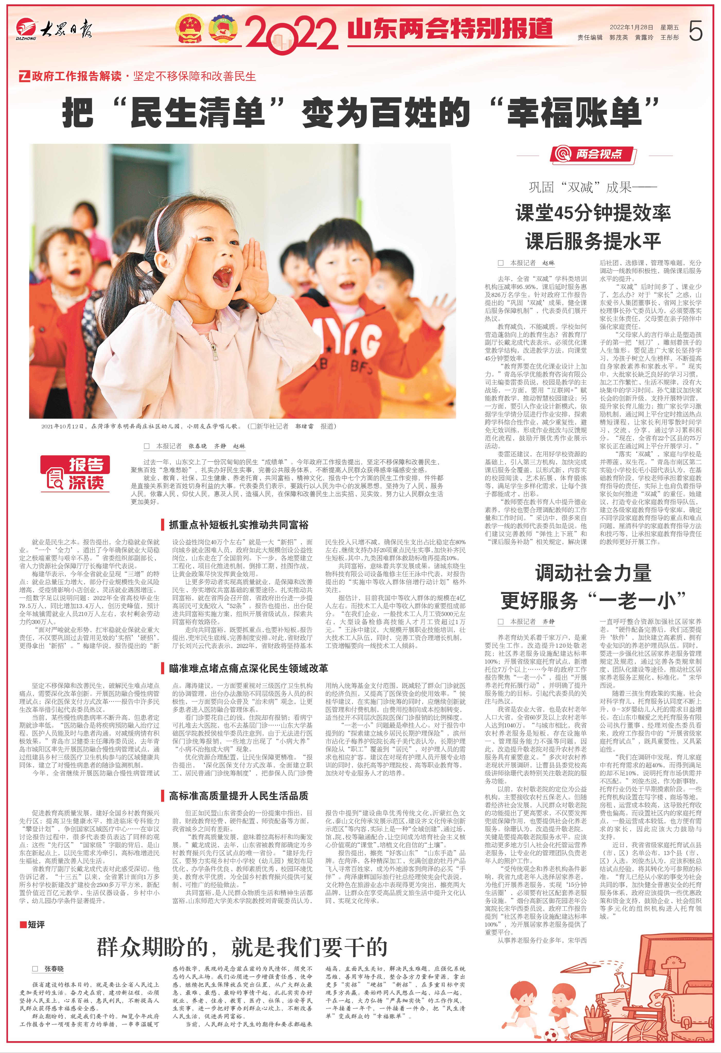 过去一年,山东交上了一份沉甸甸的民生“成绩单”。今年政府工作报告提出,坚定不移保障和改善民生,聚焦百姓“急难愁盼”,扎实办好民生实事,完善公共服务体系,不断提高人民群众获得感幸福感安全感。