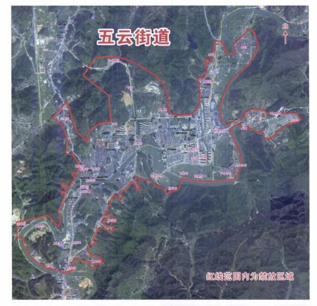 三、禁止在五云街道的镇中社区、水南社区、北门社区、风景山社区、朝晖社区、西桥社区、金梅亭社区、五里牌社区、建设村、水南村(水南/谢山)、中心村、丹阳村、东门村、三里村、洋岙村、杜桥村(杜桥/生水塘)、状元村(詹山/桥头/湾潭)、西寮村、镇东村、官店村、船埠头村、下双龙村、周村村(周村/双合)、洋潭头村(洋潭头/项山)、名山村(上名山/下名山/洋泉),330国道沿线(详见红线图)禁放范围内燃放烟花爆竹;