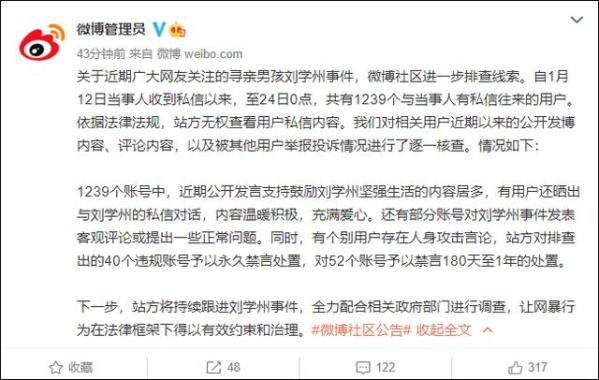 1月28日,@微博管理员 发布公告:关于近期广大网友关注的寻亲男孩刘学州事件,微博社区进一步排查线索。自1月12日当事人收到私信以来,至24日0点,共有1239个与当事人有私信往来的用户。