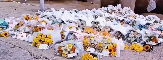 刘学州出事的海边,摆满网友们送来的悼念鲜花和甜品