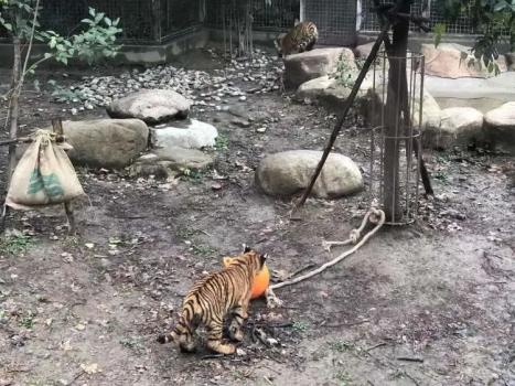 对于老虎、狮子这样的猛兽,动物园一般都采取传统的投喂方式,这样的静态取食方式稳妥可靠,但对于游客来说,会欠缺观赏性,对于老虎来说,这样“饭来张口”的取食模式,会逐渐弱化它们的捕食技能、消磨它们的野性。