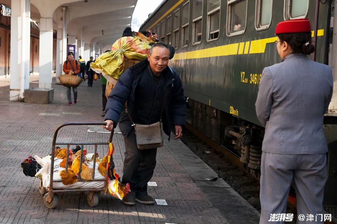 老乡们携带的土鸡吸引了乘客,火车还没到站,在车上就有乘客买了土鸡。
