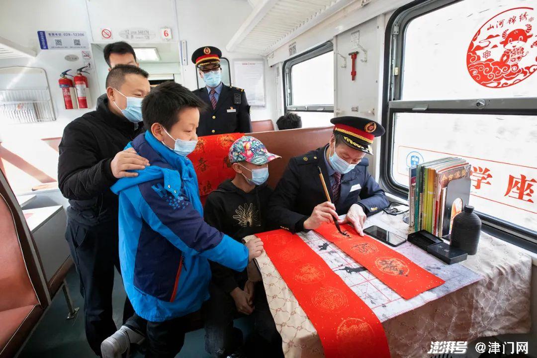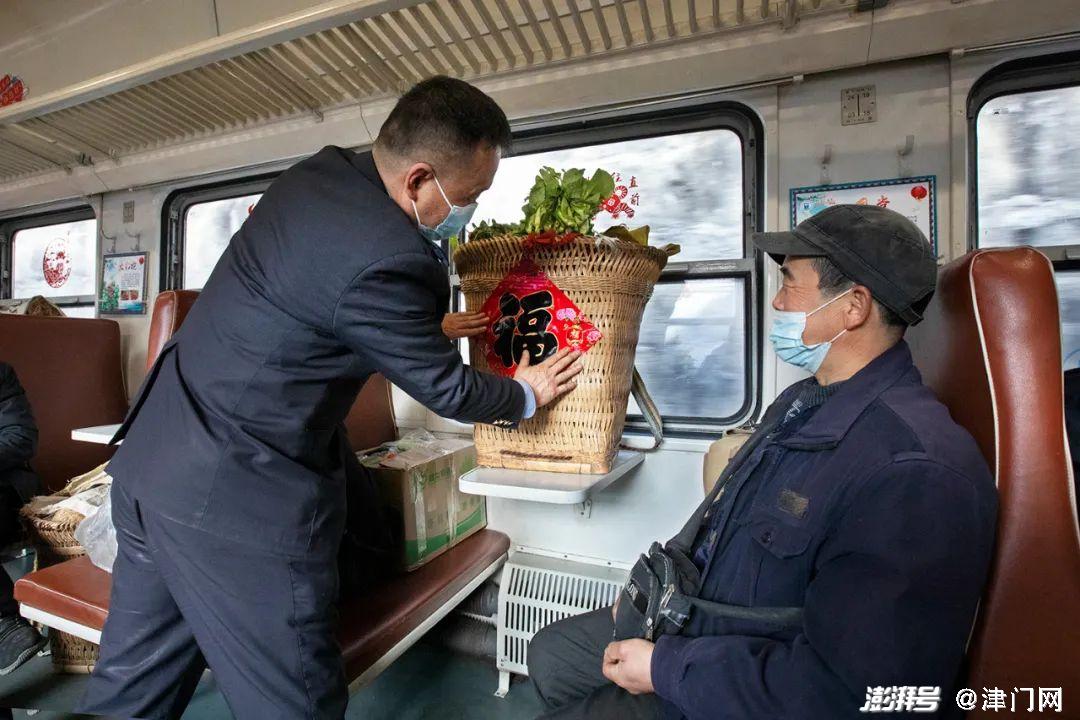 列车长正在为乡亲们送“福”字,红红火火的“福”字凝聚着铁路人对乡亲们美好生活的祝福。