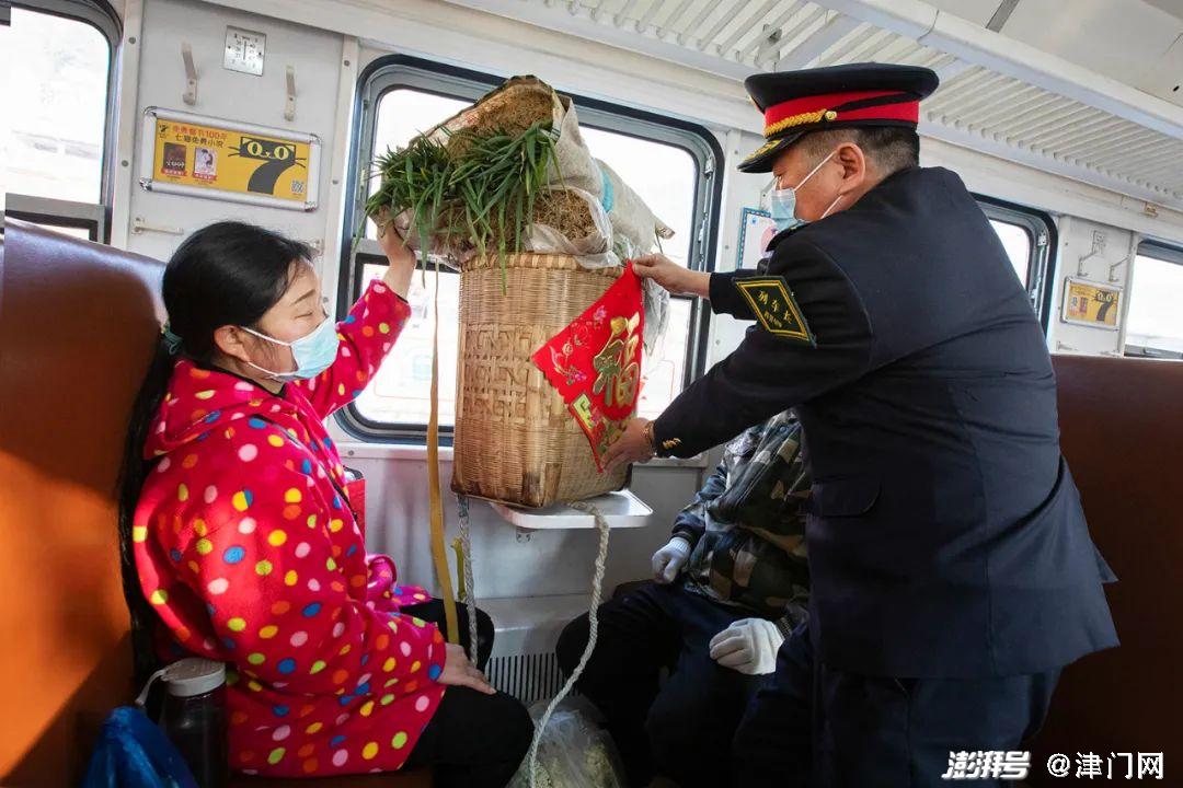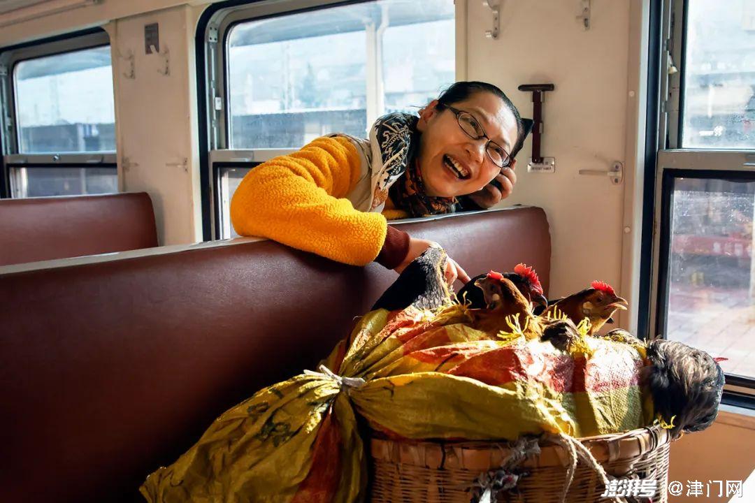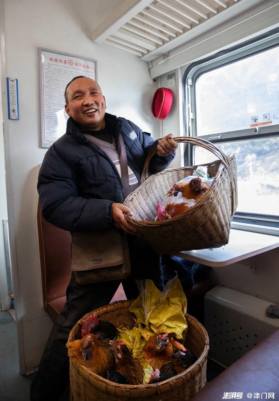 车厢里熙熙攘攘,欢声笑语,青菜绿莹,水果飘香,鸡鸭满筐,春意融融。