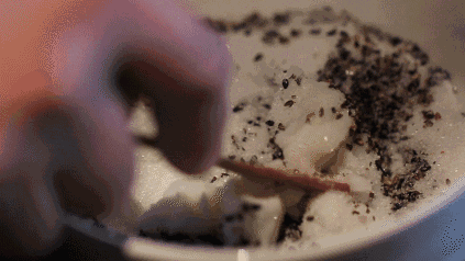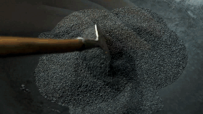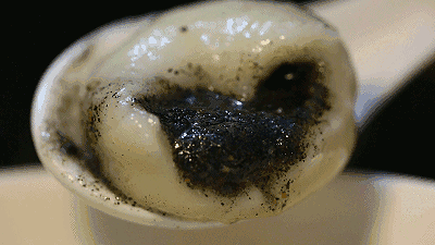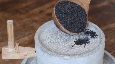 于是,我守在阿娘边上,看她把芝麻放进石舀,看着芝麻一粒粒变成了漆黑的一团。阿娘很费力气地把黏成一团的芝麻从石舀中取出来,我想该好好品尝芝麻了。