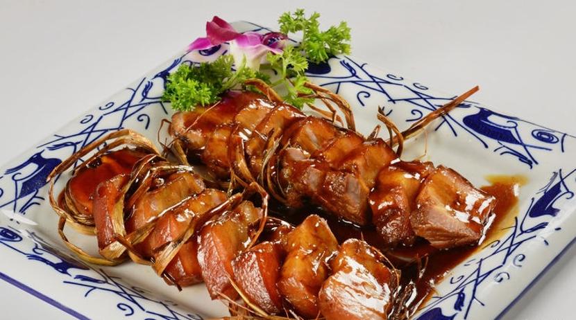 第一步:叉烧汁30克、生抽5克、味极鲜50克、味精5克、黄酒5克,香叶、八角、片糖少许,调成酱汁备用。第二步:将五花肉切成长条状,用禾草将肉条捆住,放进瓦煲内,淋上调好的酱汁,加盖煲一小时左右,其间要开盖将肉条翻转2次。开盖用筷子刺一下肉,能顺利刺进去就证明火候够了。