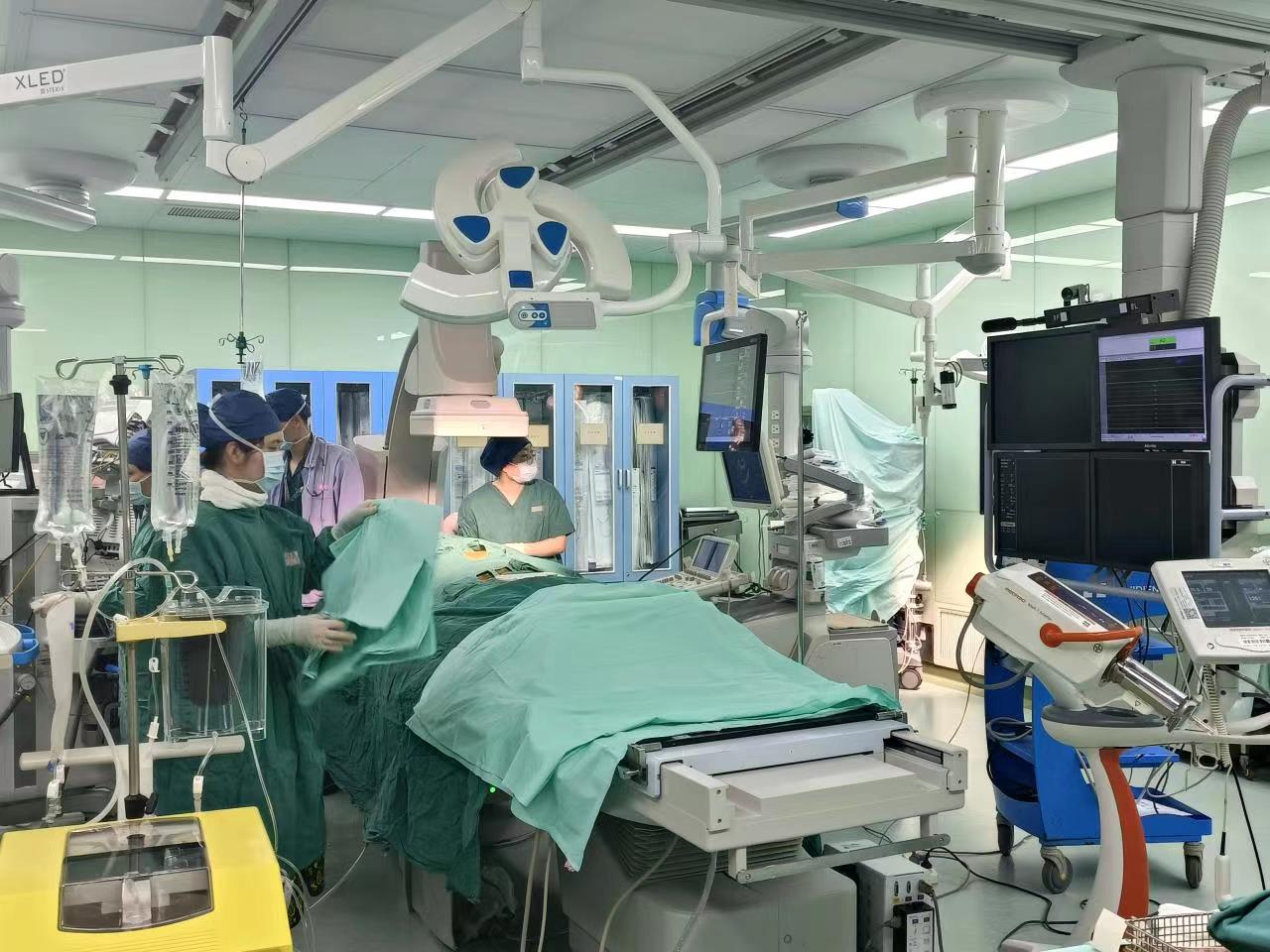 1月29日,手术在儿科医院心血管杂交手术室内进行。该院心血管中心主任贾兵教授主刀,心内科主任刘芳教授精准定位,同时在心导管造影和食道心超的双重精确引导下,贾兵经由右心室表面穿刺,准确地将支架瓣膜放置到肺动脉的预定位置,同时环缩肺动脉,缝合固定支架瓣膜。造影和心超均显示,小义肺动脉支架瓣膜功能完好。