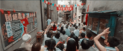上图:《你好,李焕英》中主角因为成为全厂第一个买电视的人而无比激动。©《你好,李焕英》中图:《你好,李焕英》中有全场人聚在一起看排球比赛。©《你好,李焕英》