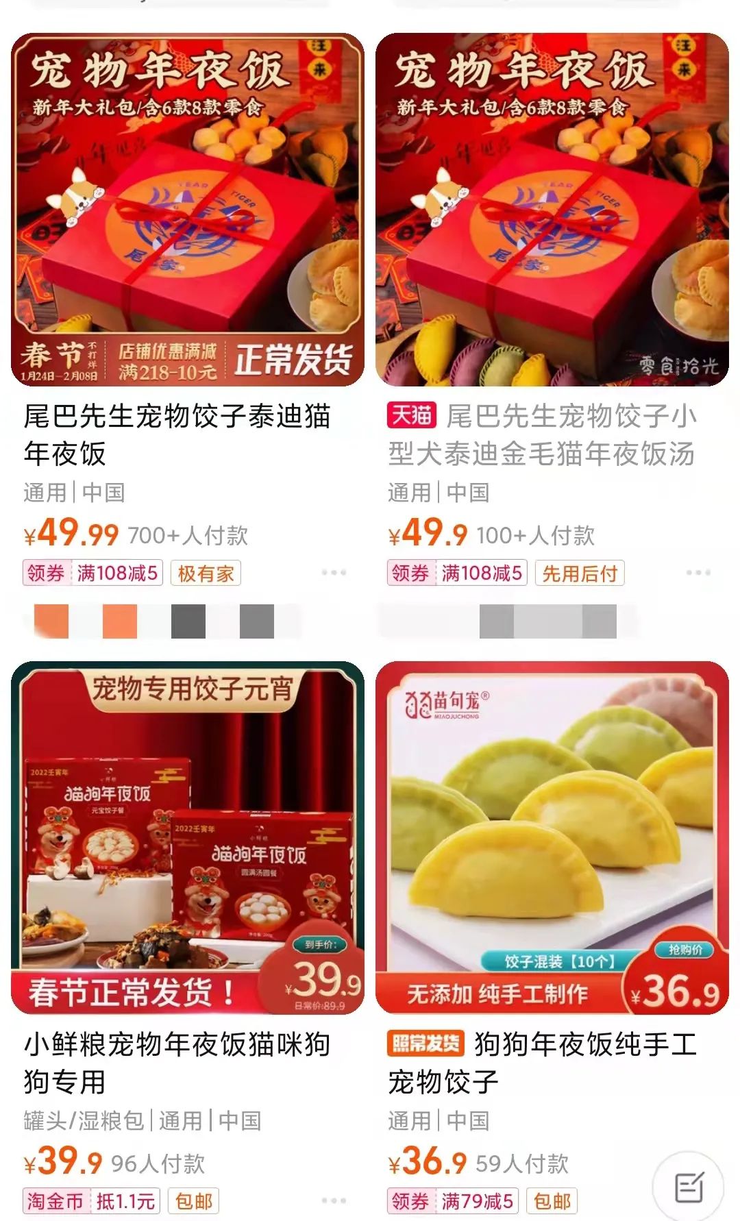 在网购平台上,店家纷纷推出宠物年夜饭大礼包,除了给每道菜命名——“大展宏图”(兔子肉)、“鸟语花香”(鹌鹑配草莓)、“四喜丸子”(肉丸)、“年年有鱼”(深海鱼),等等,还强调食材和制作的讲究——“新鲜食材,手打肉馅”“低温慢煮,皮薄馅紧”。有些店家的宠物水饺售价高达68元一份,让人感慨:手上这份18元的韭菜鸡蛋水饺马上不香了。