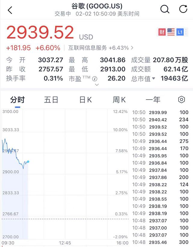 其中,谷歌母公司Alphabet开盘上涨10%,市值一度暴涨一万亿人民币,股价最高报3041美元/股,总市值站上2万亿美元,成为继苹果、微软之后第三家总市值达2万亿美元的科技公司。截止发稿,涨幅稍有回落。