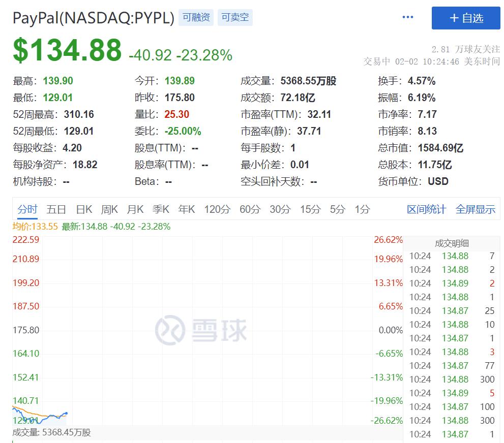 财报显示,第四季度总支付量仅增长了23%,是两年来最低增幅,并且低于分析师的预期。报告显示,PayPal第四季度净营收为69.18亿美元,与上年同期的61.16亿美元相比增长13%,不计入汇率变动的影响同样为同比增长13%;净利润为8.01亿美元,与上年同期的15.67亿美元相比下降49%。分析称,在疫情期间股价上涨数倍的这些公司已经基本回到原点,因为防疫封锁时期对他们服务的旺盛需求来也匆匆去也匆匆。PayPal的第四季度数据也是如此,促使投资者抛售该股,盘中下跌23%,有望创下历史最大单日跌幅。