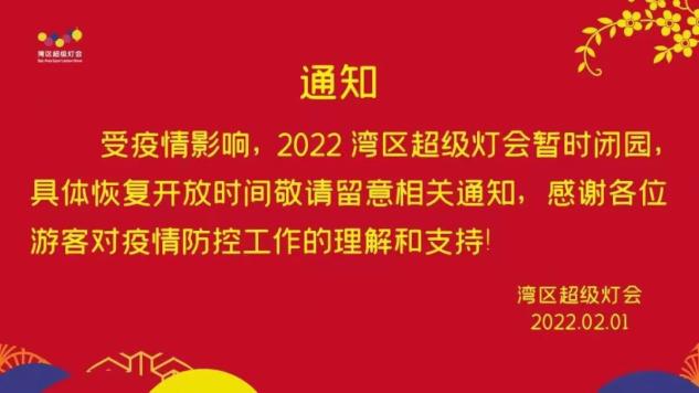 据“湾区超级灯会”消息,灯会园区暂时闭园,具体恢复开放时间将另行通知,完整通知如下: