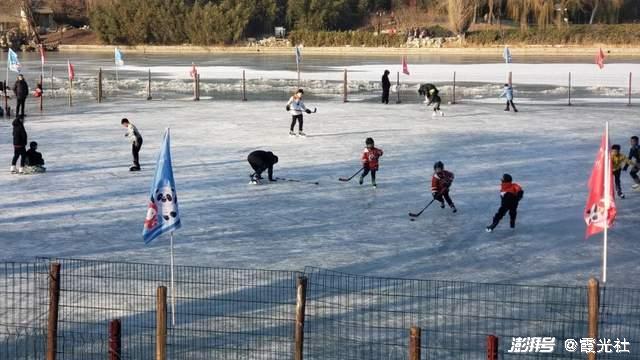 北京紫竹院公园内,几名少年在打冰球,图源:麻吉/摄