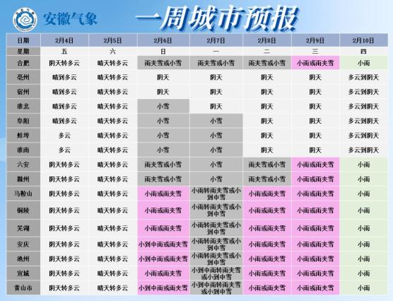 6日(初六):全省阴天,淮北部分地区和江淮之间北部有雨夹雪或小雪;江淮之间南部和江南有小到中雨转雨夹雪或小到中雪,其中大别山区有大雪,局部暴雪。