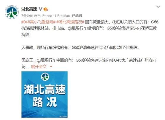 因车流量偏大,①临时关闭入口的有:G56杭瑞高速枫林站、排市站。②现场行车缓慢的有:G50沪渝高速渝沪向花桥至黄梅段。