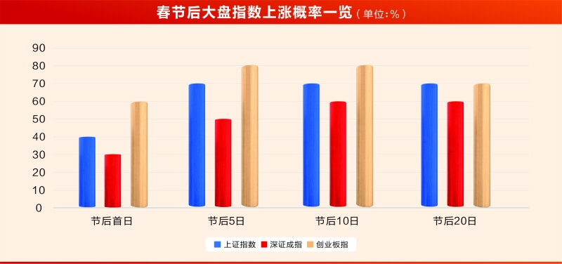 以深证成指来看,节后首日上涨概率仅为30%,后5日、后10日和后20日的上涨概率分别上升至50%、60%和60%。创业板指在节后的表现相对较好,节后首日上涨概率达到60%,后5日和后10日的上涨概率均达到80%。