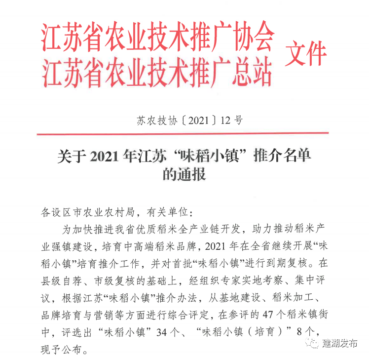 日前,省农业技术推广协会和省农业技术推广总站公布了2021年江苏“味稻小镇”推介名单颜单镇榜上有名。
